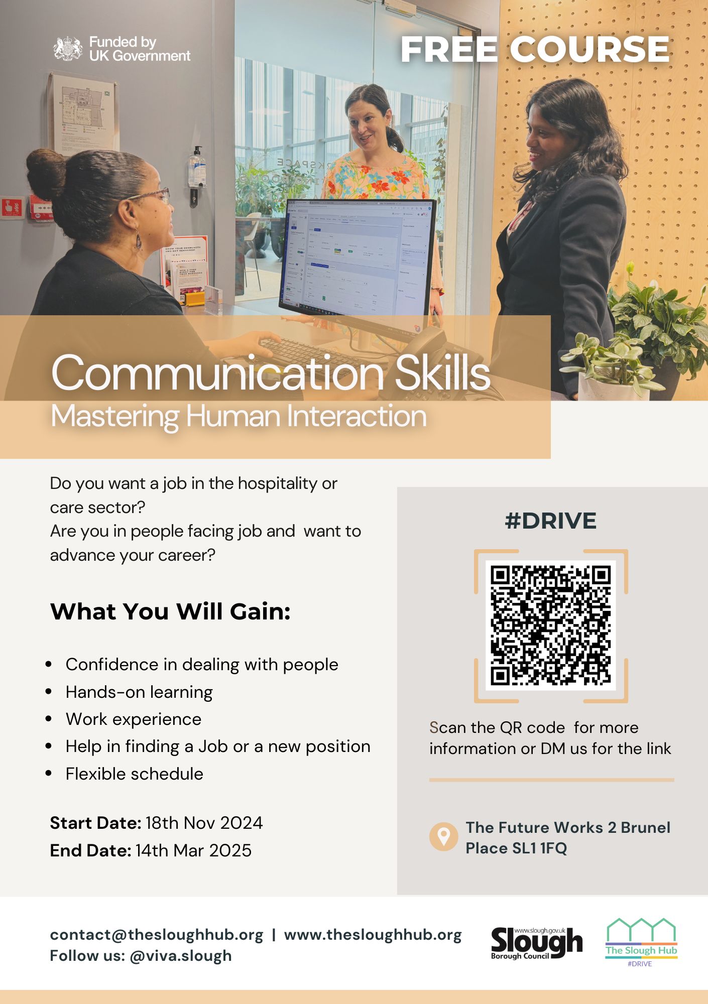 We are excited to introduce Viva Slough’s Communication Skills Course—a comprehensive, free, 4-month program designed to help individuals master communication skills, specifically for careers in the hospitality and care sectors.
