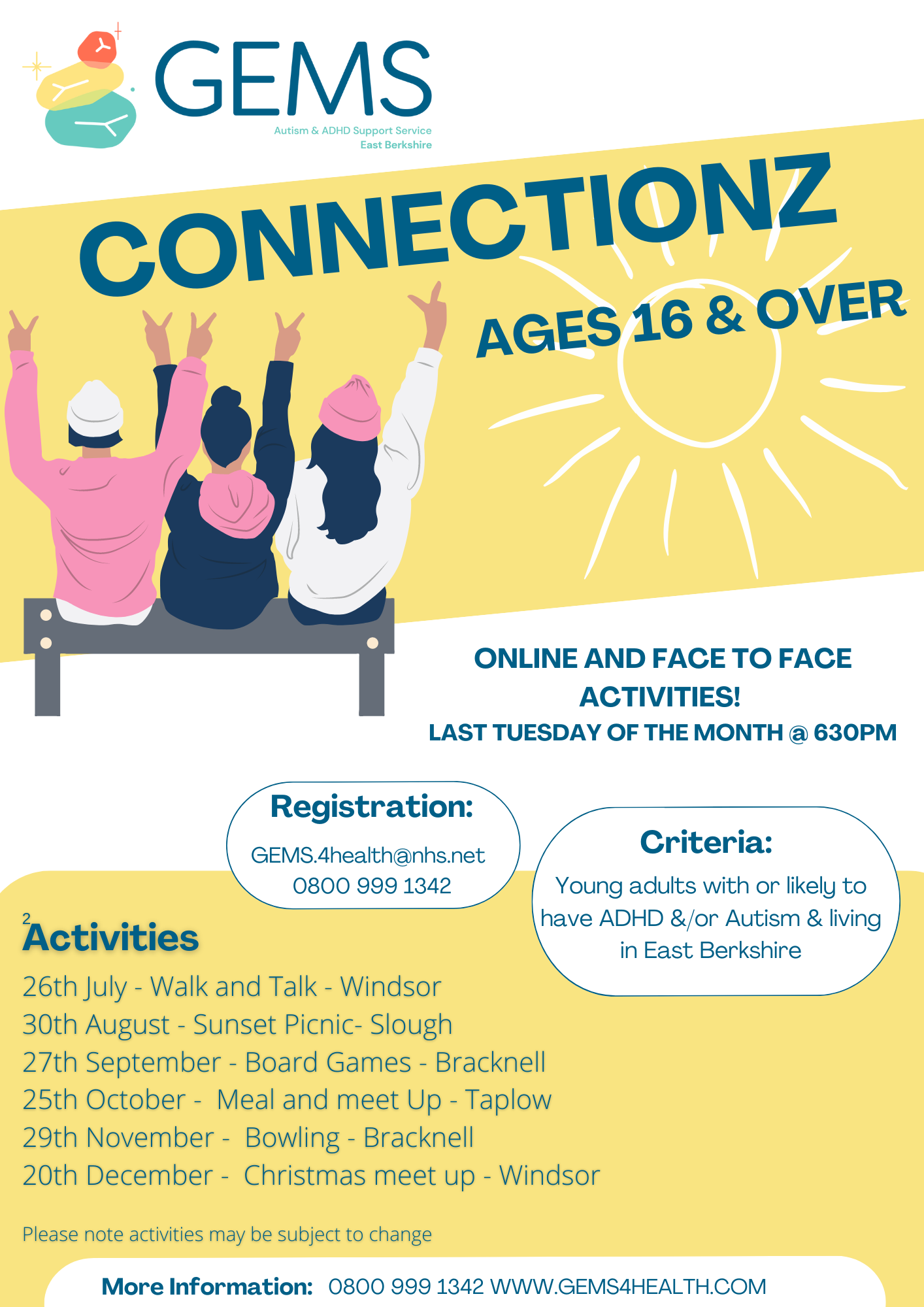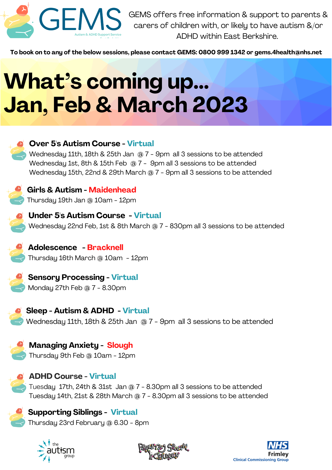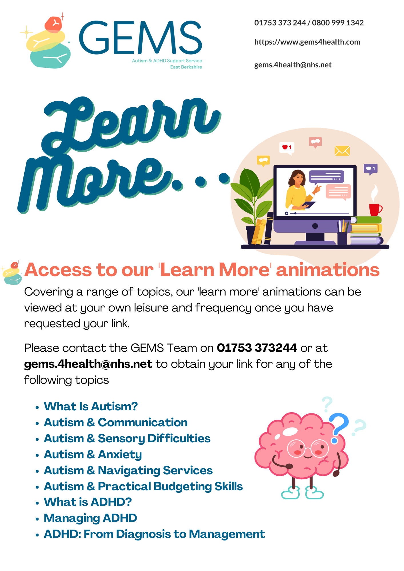 GEMS is for children, young people and adults who are diagnosed with or who may have, Autism and/or Attention Deficit Hyperactivity Disorder (ADHD). This service also supports parents and carers and is open to anyone living in Slough, RBWM or Bracknell Forest.