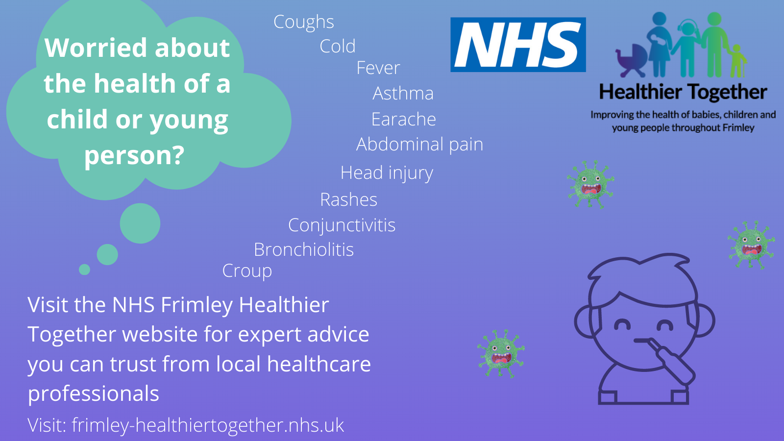 Healthier Together is a website to support local parents and carers to help them manage a range of common childhood illnesses. The site provides information to help parents/carers recognise what might be wrong, what to do to help their children whilst at home, and where to go for more help if they do need to see a healthcare professional. In most cases, childhood illnesses can be managed at home with over-the counter medication and rest.