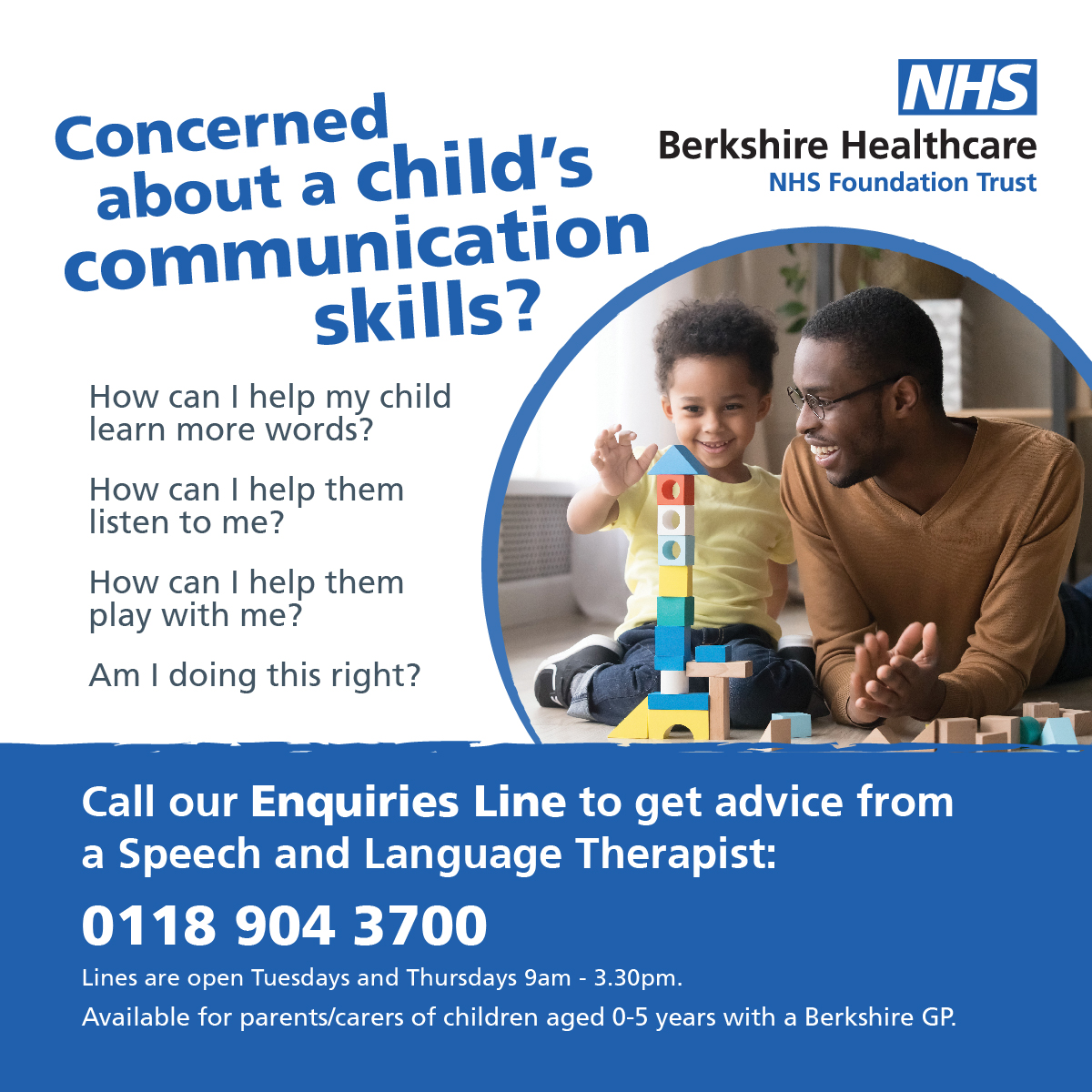 Let’s talk! The Early Years Speech and Language Therapy service in Berkshire is changing. We are adapting the way we work so that, if a family has a Berkshire GP, they can call us and speak to a Speech and Language Therapist to discuss any concerns about their pre-schooler's communication. This phone line is also for practitioners who would like to discuss communication concerns. Our phone lines will be open from 9:00 - 15:30 on a Tuesday and Thursday, starting Tuesday 9 January 2024. Many issues can be helped by talking, so let’s talk!