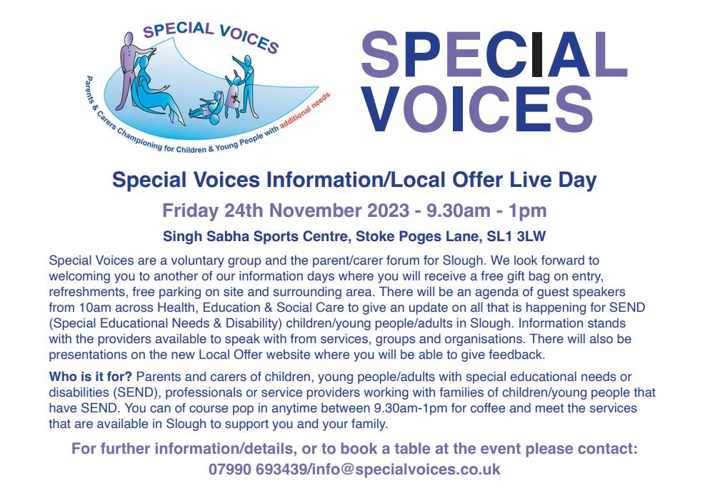 We at Special Voices are delighted to be hosting another of our Information/Local Offer Live Days at Singh Sabha Sports Hall, Stoke Poges Lane SL1 3LW on Friday 24 November 2023