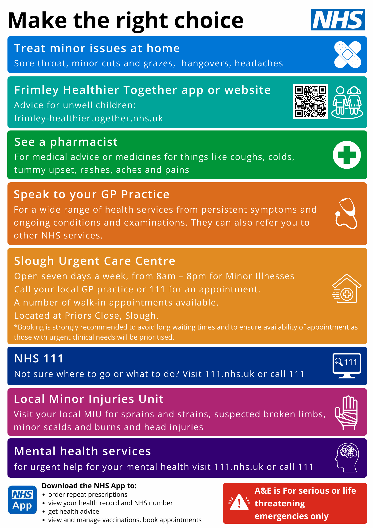 Visit https://frimleyhealthandcare.org.uk/maketherightchoice for more information and https://nhs.uk/ for further health advice.